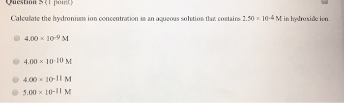 Create your own flashcards or choose from millions created by other students. To calculate the poh of a solution you need to know the concentration of the hydroxide ion in moles per liter (molarity). For water, the water ion product or kw tells us the concentration of h+ or h3o+ and the concentration of oh. A 5.0m solution of hcl has how many moles of h+ ions in 1 liter of the view answer. Dissociation of water and the formation of the hydronium ion.